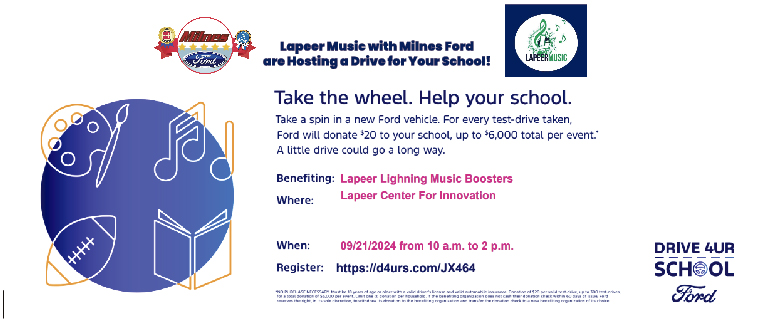 Milnes Ford and Lapeer Music are teaming up to bring you the Drive for Your School event!